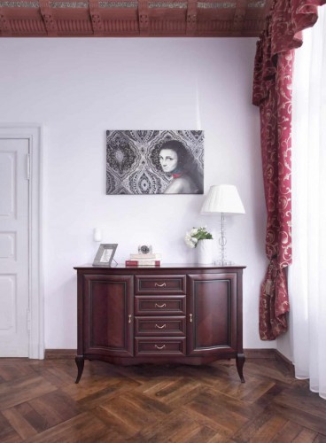 Mebel o głębokiej barwie dębu burgundzkiego z efektownymi wstawkami ze szkła Lacobel nada szyku każdemu pomieszczeniu. Lustrzane drzwi nie tylko pozwolą na komfortowe obejrzenie całej sylwetki, ale sprawią, że masywny, pojemny mebel będzie znakomicie wyglądał nawet w stosunkowo małym pokoju. Należy tylko pamiętać o takim jego usytuowaniu, by lustra odbijały okno lub wolną ścianę. Dzięki takiemu zabiegowi optycznie powiększymy wnętrze.